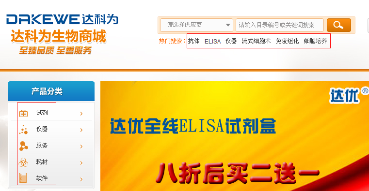 在生物城首頁可以點擊“產(chǎn)品目錄”,或者進入生物商城,通過分類或者搜索來查找產(chǎn)品