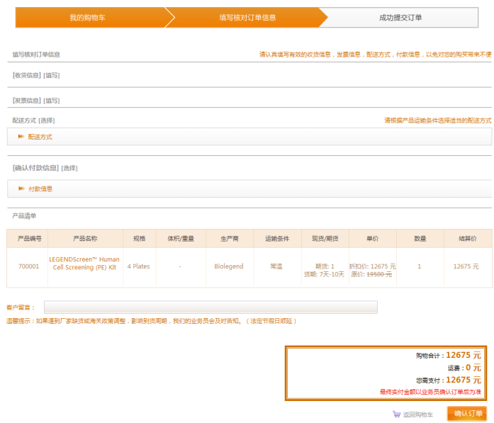 點擊購物車頁面的“結(jié)算”進入填寫訂單信息的頁面,在此頁面請認真填寫,收貨地址、發(fā)票信息、配送方式、支付方式等信息。點擊“確認訂單”即可生成訂單。