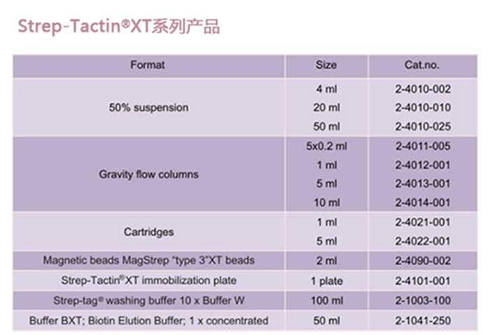 Strep-tag?是IBA lifesciences基于生物素(Biotin)和鏈霉親和素(Streptavidin)之間的結(jié)合反應(yīng)開發(fā)的蛋白純化系統(tǒng)。第三代Strep-tag?系統(tǒng):「Strep-Tactin?XT:Twin-Strep-tag?」蛋白純化系統(tǒng),其結(jié)合力可達(dá)pM級(jí)別但仍保持結(jié)合的可逆性和固定化蛋白的溫和復(fù)蘇能力。因此,用Strep-Tactin?XT系統(tǒng)能有效提高您目標(biāo)蛋白的純度,解決您實(shí)驗(yàn)中所遇到的常見問題。