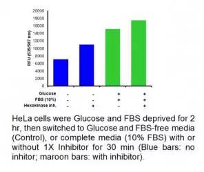 BioVision EZCellTM Glucose Uptake Assay kit 是一種簡單而超級靈敏、易用的葡萄糖攝取檢測試劑盒。試劑盒利用一種特殊的己糖激酶抑制劑抑制己糖激酶,己糖激酶是糖代謝過程中涉及到的第一個酶,在葡萄糖被細胞攝取后,可捕獲葡萄糖。 葡萄糖攝取是利用一系列酶反應檢測的,被氧化的葡萄糖產生的中間產物可以與OxiRed?探針反應而發出熒光信號(Ex/Em=535/587 nm) 。熒光信號量直接反應細胞所攝取和積累的葡萄糖。不像其他試劑盒是直接檢測葡萄糖衍生物,BioVision 提供了一種直接而強大的葡萄糖研究工具,可用于篩選和表征葡萄糖攝取相關疾病的藥物。