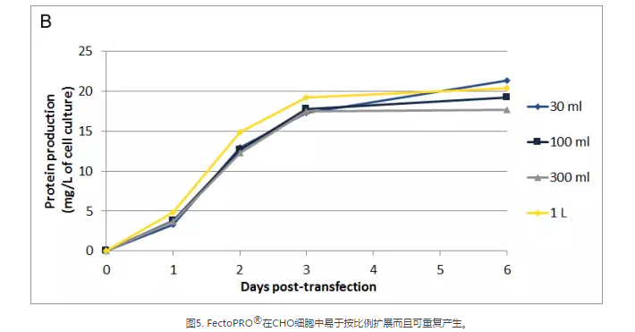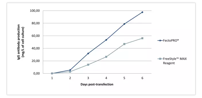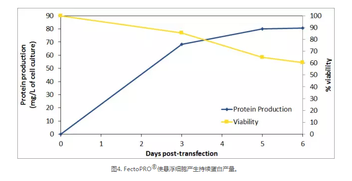過去幾年,蛋白質生產的持續時間有所增加,大部分蛋白質生產過程持續1~2周,以獲得最佳的蛋白產量。FectoPRO?確保幾天內產生持續的蛋白產量,同時保持較高的細胞活力以延長蛋白生產。