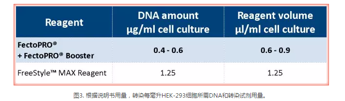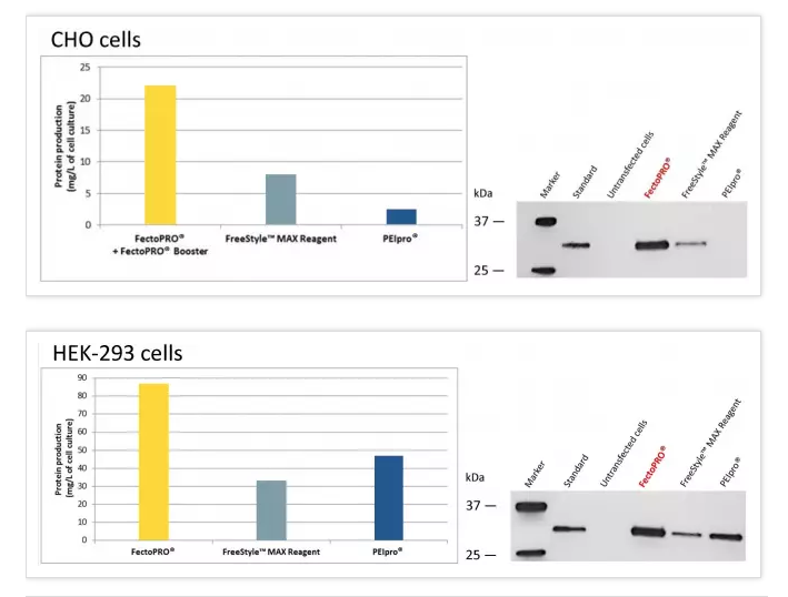 圖2. FectoPRO?大幅提高懸浮CHO和HEK-293細胞的蛋白產量。按1×106個細胞/ml的密度將FreeStyle? CHO-S和HEK-293F細胞培育在30 ml的無血清培養基中,并依照每種試劑說明書推薦用量FectoPRO?+FectoPRO?輔助藥劑Booster (0.4 μg DNA/ml)、FreeStyle?MAX試劑(1.25 μg DNA/ml)或PEIpro?(1 μg DNA/ml)進行轉染。用蛋白質G親和性定量法(HPLC)和Western Blot檢測轉染后72小時(CHO細胞)和120小時(HEK-293細胞)的IgG3-Fc (34 kDa)的產量。