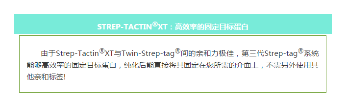 Strep-tag?是IBA life sciences基于生物素(Biotin)和鏈霉親和素(Streptavidin)之間的結合反應開發(fā)的蛋白純化系統(tǒng)。第三代Strep-tag?系統(tǒng):「Strep-Tactin?XT:Twin-Strep-tag?」蛋白純化系統(tǒng),其結合力可達pM級別但仍保持結合的可逆性和固定化蛋白的溫和復蘇能力。因此,用Strep-Tactin?XT 系統(tǒng)能有效提高您目標蛋白的純度,解決您實驗中所遇到的常見問題。