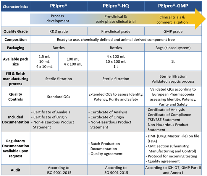 表1.Polyplus-transfection?提供一系列不同級別PEIpro?,滿足從工藝開發、臨床前、到臨床級別病毒載體的生產需求