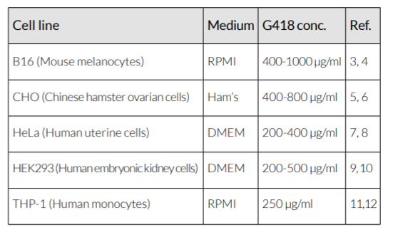 InvivoGen建議的工作濃度:G418通常以400 μg/ ml的濃度使用。當然仍需要為您的細胞確定最佳濃度。下面列出了常見哺乳動物細胞使用G418篩選的濃度(參見下表)。