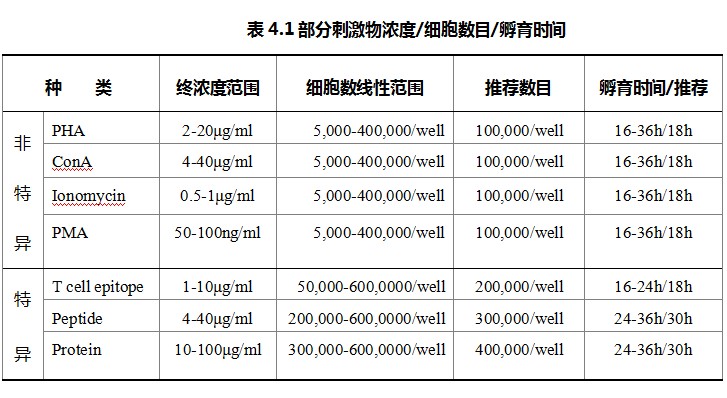 不論是普通多肽(比如重疊多肽庫)還是蛋白質或者蛋白類的組織提取物,這些刺激物都需要APC的攝取、內化、加工、呈遞,之后T細胞才能被刺激。所以,使用這些刺激物的時候,一定要保證足夠的細胞密度。根據我們的經驗,細胞密度要至少達到20萬-30萬每孔。多肽推薦的細胞密度為30萬/孔,蛋白推薦的細胞密度為40萬/孔。也可以根據實際情況,在線性范圍內調整,參見表4.1與圖4.2。