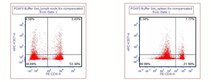 BioLegend FOXP3 Buffer set對(duì)細(xì)胞進(jìn)行固定破膜處理后,染Ki-67抗體,左圖:小鼠淋巴結(jié)樣本;右圖:小鼠脾臟樣本。
