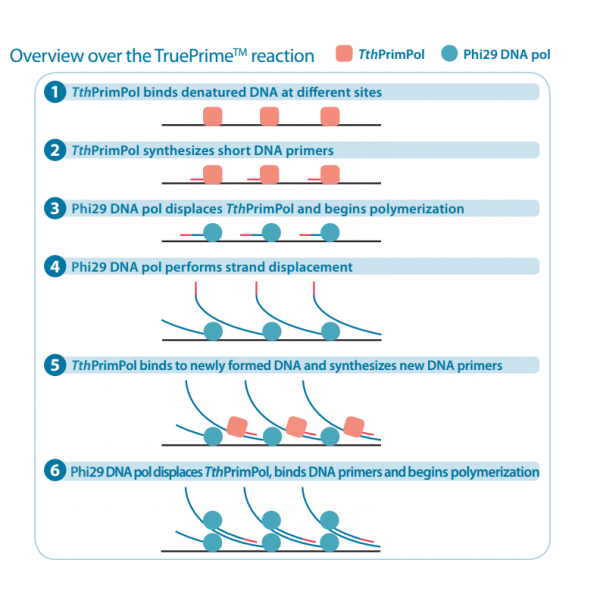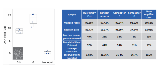 TruePrime?采用MDA技術,基于新型的TthPrimPol 引物酶和Phi29 DNA聚合酶,擴增過程無需添加隨機引物,減少了擴增偏倚,提高了擴增過程的覆蓋率和保真性,并且對于污染的外源DNA不敏感,可重復性好。TruePrime?可用于單個細胞或少量細胞的全基因組擴增,與常見的NGS平臺如Illumina和IonTorrent等兼容性良好。