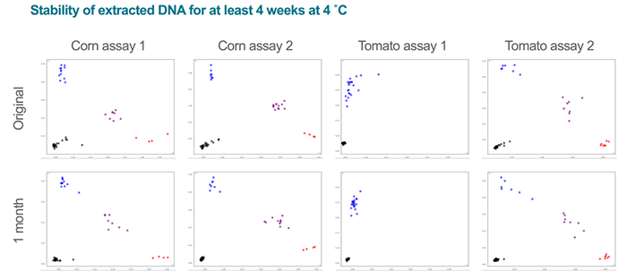 △圖2. 用QuickExtract從玉米和番茄中提取的DNA用KASP基因分型技術進行聚類(Original),然后在4℃下儲存1個月,再將樣品進行聚類(1month) ,實驗結果完全一致。
