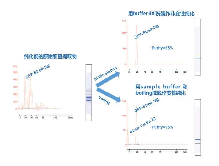 使用Agilent Bioanalyzer 2100 System分析提取出來的蛋白,發現不管是直接以Buffer BXT (含Biotin)將靶蛋白洗脫下來,或是加入sample buffer煮沸來分離目標蛋白,都能得到高純度的蛋白。