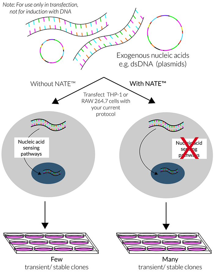 在真核細胞轉染期間,外源核酸(如質粒DNA)的主要障礙是它們會被胞質傳感器檢測,如cGAS/STING,AIM2炎癥小體和LC3介導的自噬。這些防御性級聯信號的激活通常會導致低轉染效率、降低的細胞活力和不一致的結果,尤其是在難轉細胞(如免疫細胞)的轉染實驗中。NATE?抑制許多核酸感應途徑,從而保護外源DNA并促進其表達。