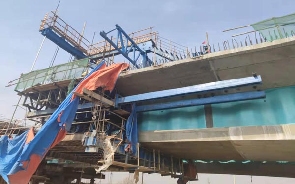 6、在底模蕩移前,必須詳細(xì)檢查掛籃位置、后端壓重及后吊桿安裝情況是否符合要求。應(yīng)先將上橫梁兩個(gè)吊帶與底模下橫梁連接好,確認(rèn)安全后,方可蕩移。