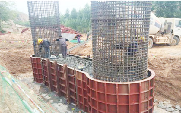 由于地面標高高于系梁底標高,故而必須開挖土方至系梁底標高向下250px左右,以便進行系梁施工?;硬捎猛跈C開挖,坑壁及基底500px采用人工修整,基底夯實。為防止機械開挖造成對灌注樁樁身的破壞,樁位附近基坑采用人工開挖,其平面尺寸比系梁底面積略大,應(yīng)留有立模操作空間,基坑開挖基底比基礎(chǔ)平面尺寸寬1250px。